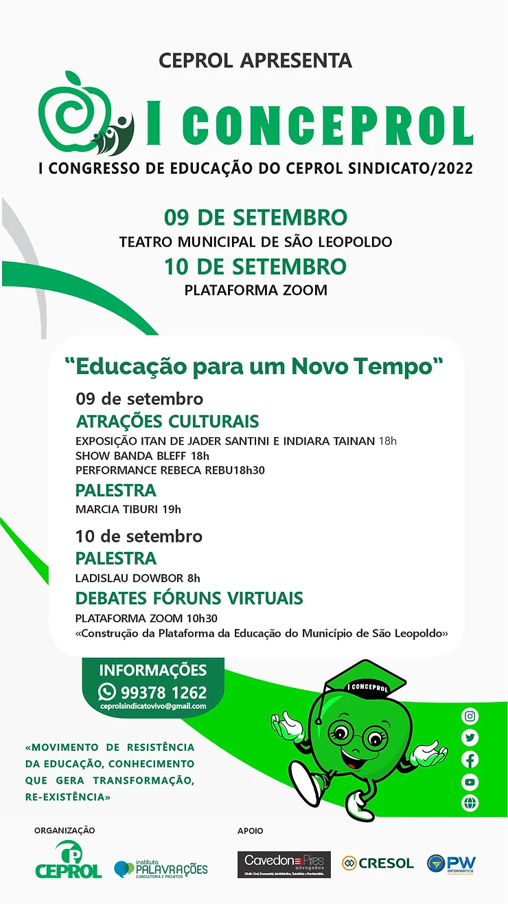 CEPROL SINDICATO DOS PROFESSORES MUNICIPAIS LEOPOLDENSES APRESENTA OI CONCEPROL, com o tema:"Educação para um Novo Tempo"Se realizará em 09 de setembro no Teatro Municipal de São Leopoldo, das 18h às 22h, e em 10 de setembro no Formato virtual/Plataforma Zoom, das 8h às 12h30.Serão dois dias de intensas atividades em... Leia mais