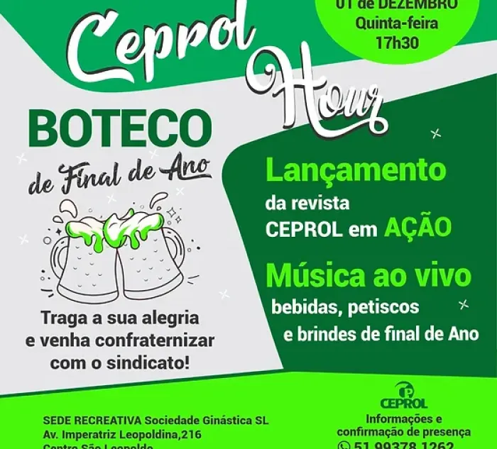 A confraternização de final de ano de 2022 ocorrerá num formato diferente dos últimos anos. No dia 01/12 (Quinta-feira), a partir das 17h30, a direção do CEPROL irá proporcionar aos seus e suas associadas um CEPROL HAPPY HOUR na sede recreativa da Sociedade Ginástica.Será um encontro no estilo Boteco, à... Leia mais