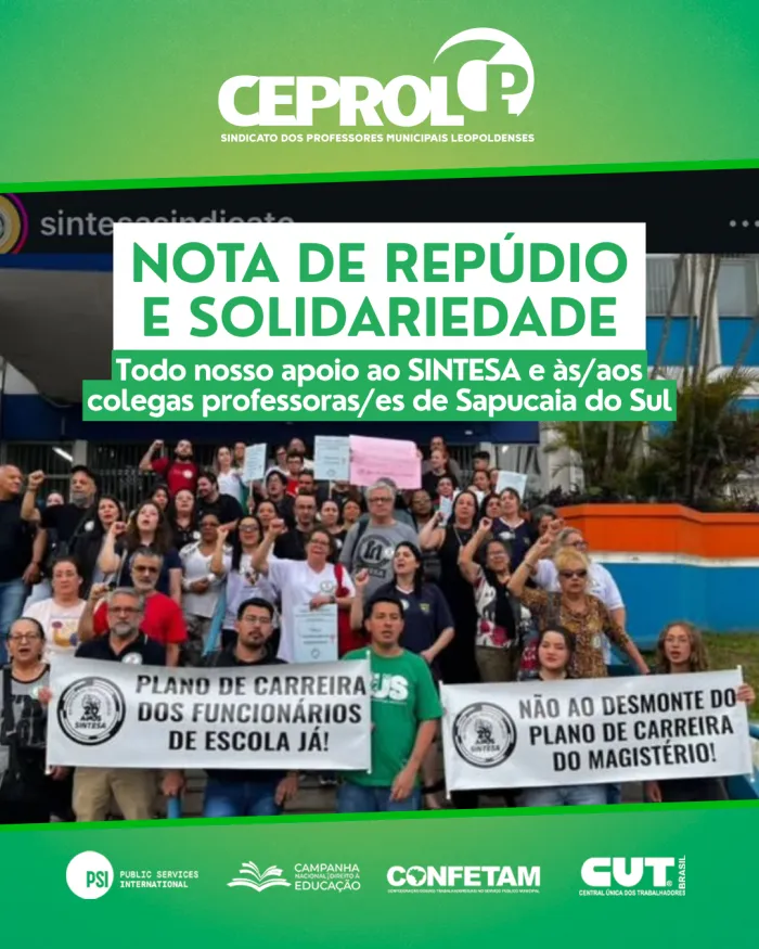 O CEPROL vem a público manifestar REPÚDIO aos ataques e ao tratamento truculento e desrespeitoso sofridos pela companheira Mirian Mattos, presidenta do SINTESA, e por toda a categoria docente durante sessão na Câmara de Vereadores de Sapucaia do Sul, nesta quinta-feira (18/09).Mirian é representante sindical das professoras e... Leia mais