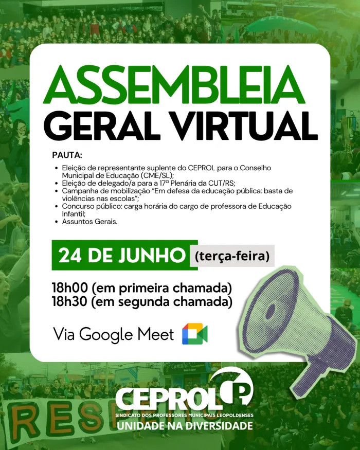 O CEPROL convoca todos/as os/as professores/as da Rede Municipal de Ensino de São Leopoldo, associados/as ao sindicato, para participarem da Assembleia Geral Ordinária!🗓 Data: 24 de junho de 2025 (terça-feira)⏰ Horário: 18h00 (1ª chamada) | 18h30 (2ª chamada)💻 Modalidade: VIRTUAL , pelo link 👉 https://meet.google.com/uuf-ymbk-uwv📌 PAUTA :✅ Eleição... Leia mais